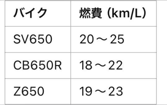 燃費性能を比較すると、他の650ccクラスのバイクと比べても優秀な部類に入ります。
