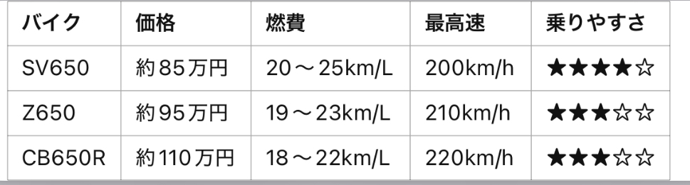 SV650は価格が安く、コスパに優れるバイク であることが分かります。