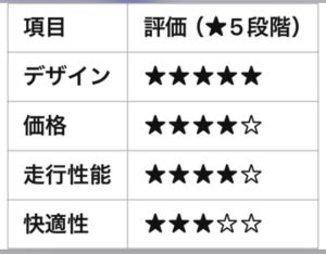 GROM125は デザイン・価格・走行性能・快適性 の4つの項目で評価すると、以下のようになります。
