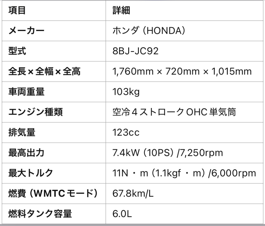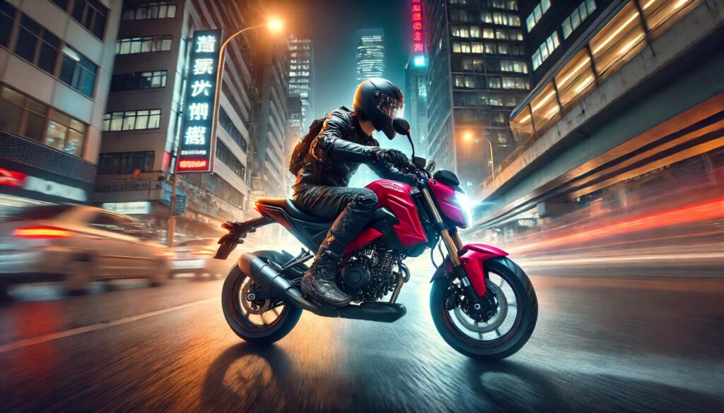 GROM125の 最高速度は約95km/h前後 です。一般道では問題なく走れますが、幹線道路やバイパスでは 流れに乗れないことがある ため、速度を重視する人には向かないかもしれません。