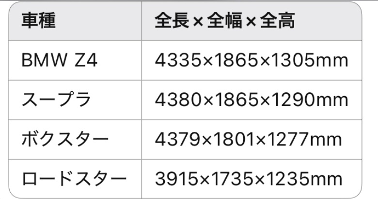 Z4・スープラ・ボクスターは同等のサイズ感。ロードスターはコンパクトで軽快さが際立ちます。