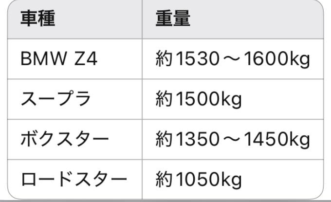 ロードスターの軽さは圧倒的。**Z4とスープラはどちらもどっしり系。ボクスターは中間的存在。