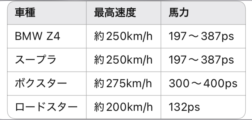 パワーならボクスター。Z4・スープラも十分ハイパワー。ロードスターは軽さを活かした走りが魅力。