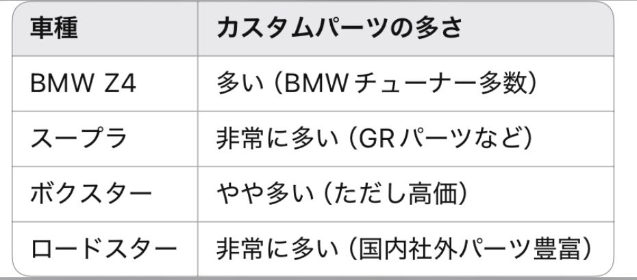 スープラとロードスターはチューニング・ドレスアップパーツが豊富。Z4は輸入車向けの選択肢多数。