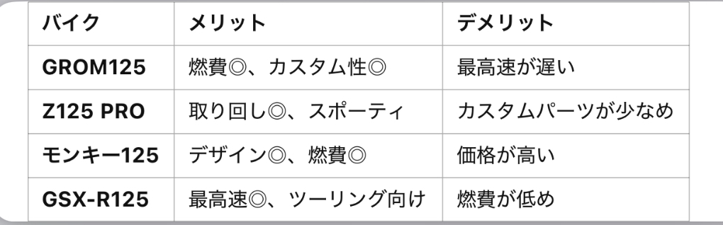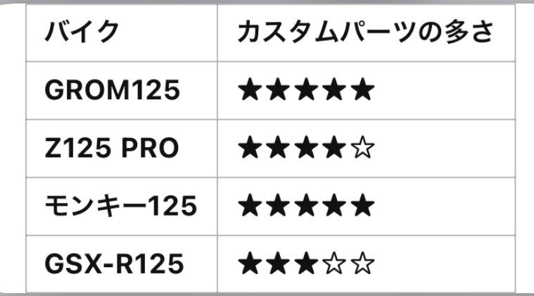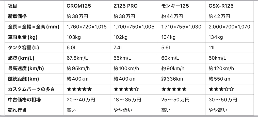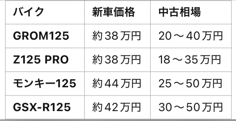 → GROM125とZ125 PROが価格的に安価で、モンキー125とGSX-R125はやや高価。中古市場でもモンキー125はプレミア価格になりやすい。