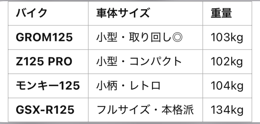 ✔ GROM125・Z125 PRO・モンキー125・GSX-R125のスペック比較