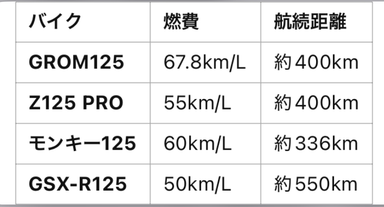 → GROM125が最も燃費が良く、GSX-R125はタンク容量が大きいため航続距離が長い。
