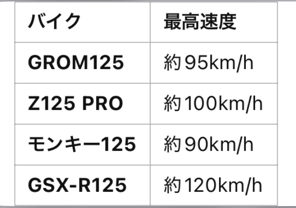 → GSX-R125が最速で、GROM125・Z125 PRO・モンキー125はやや控えめ。