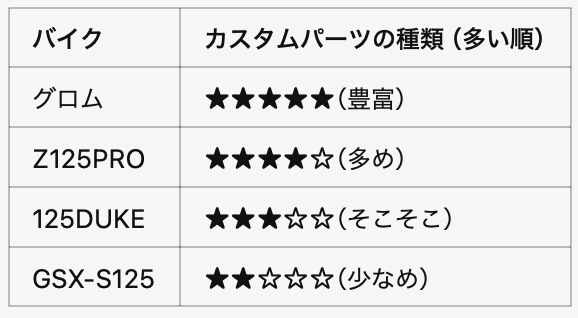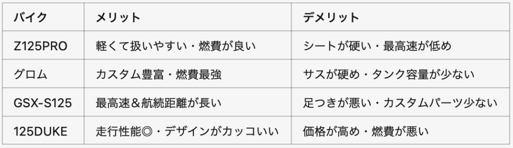 ✅ Z125PRO・グロム・GSX-S125・125DUKEの違いを徹底比較