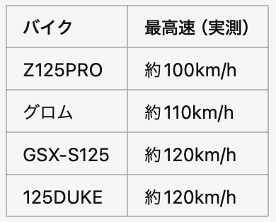 ✅ 各バイクのスペック(価格・サイズ・燃費・最高速など)を一覧化