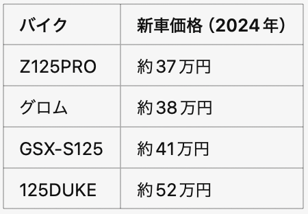✅ Z125PRO・グロムは価格が近く、お手頃