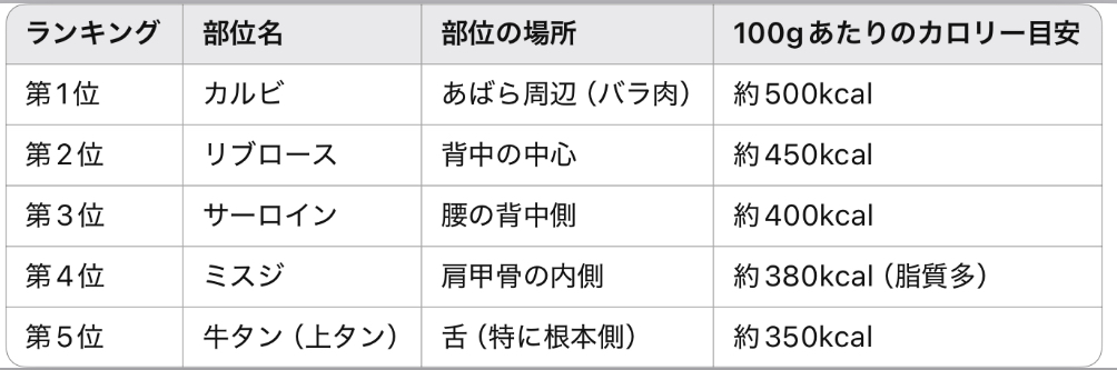 特に人気の高い部位や、柔らかくてジューシーな肉ほど脂質が多く、カロリーも高め。