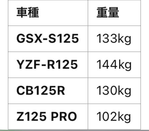 バイクの重さは 駐車時の取り回しや発進時の操作性 に影響します。軽いほど扱いやすく、初心者向けです。