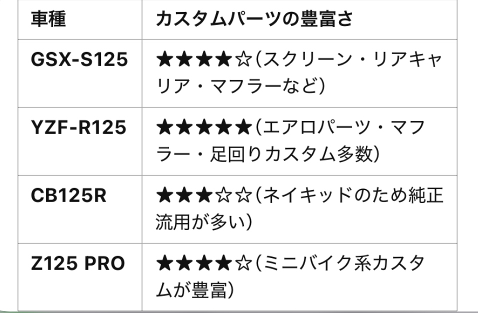 カスタムパーツの多さは バイクを自分好みにカスタムしたい人にとって重要 です。