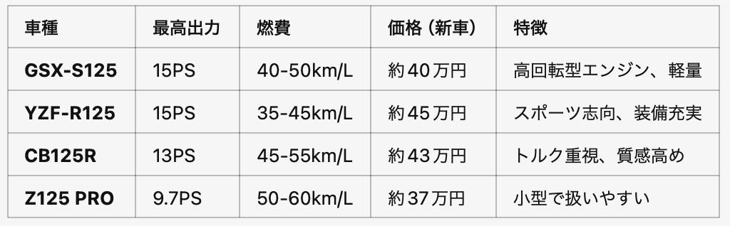 GSX-S125と競合する125ccバイク3車種と比較しました。