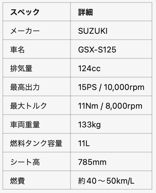 GSX-S125は、高回転型のスポーティなネイキッドバイクで、燃費の良さと軽量なボディが魅力。しかし、低速トルクの弱さや高速道路に乗れない点には注意が必要です。