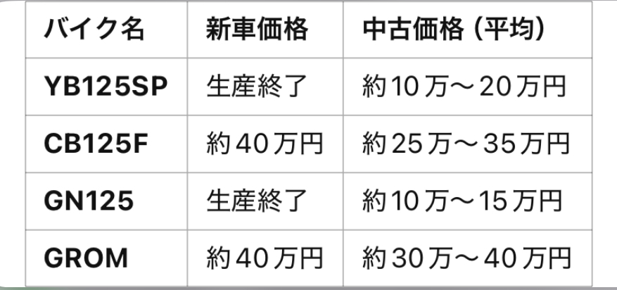 YB125SPとGN125は中古メイン、CB125FとGROMは新車購入可能。