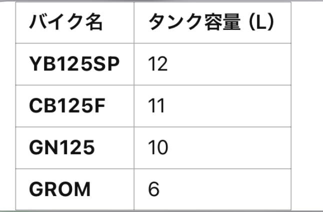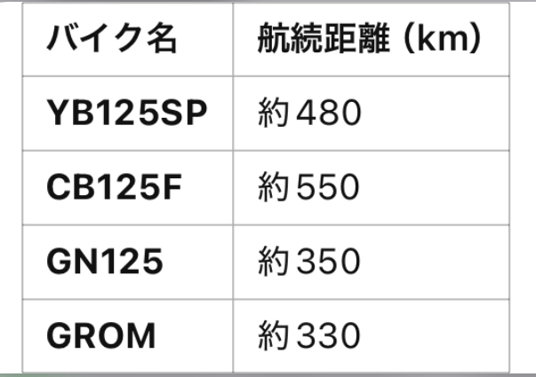 YB125SPが最もタンク容量が大きく、航続距離が長い。