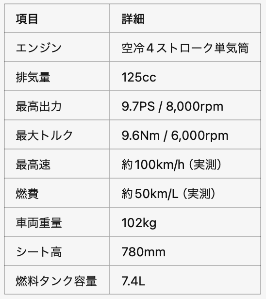 実測燃費は約50km/L前後と、125ccクラスとしては優秀な部類に入ります。ただし、タンク容量が7.4Lと小さいため、航続距離は約370kmほどになります。