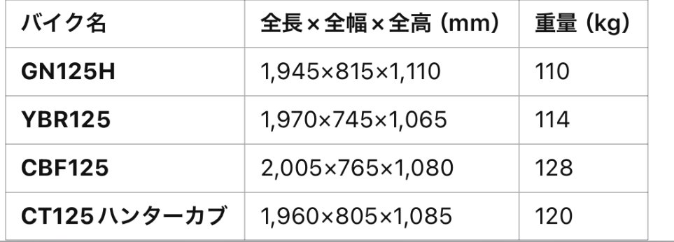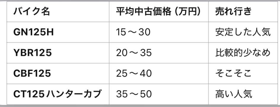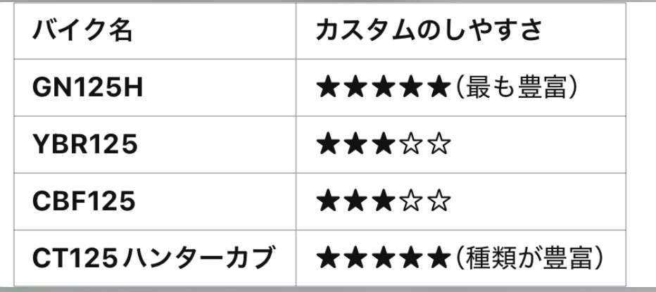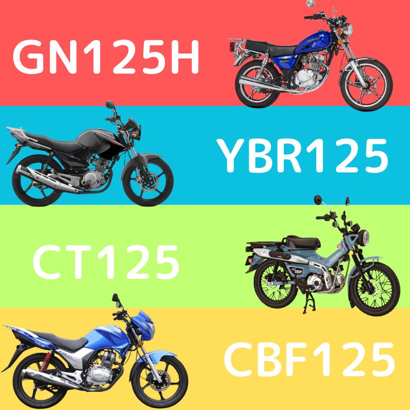 特に、GN125H・YBR125・CBF125・CT125ハンターカブ の4台は、125ccバイクを検討する際に比較されやすいモデルです。