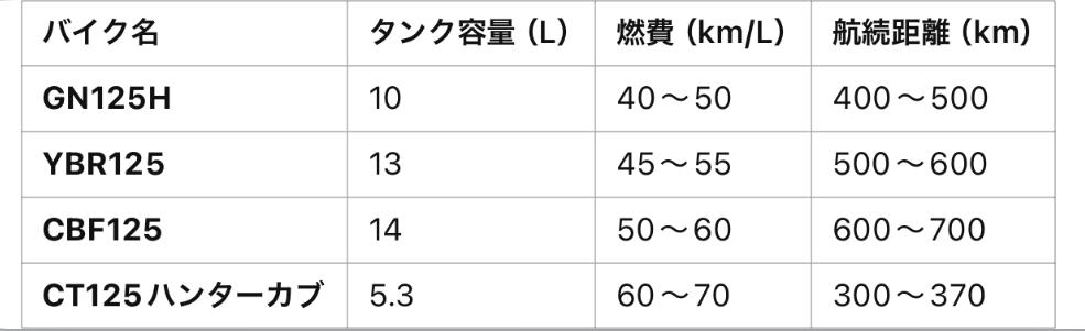 CBF125は燃費・タンク容量ともに優秀で航続距離最長。