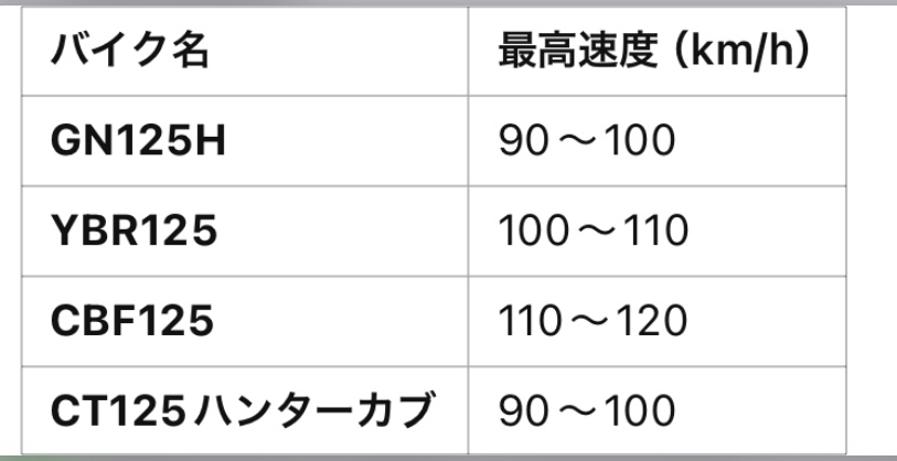 GN125H・CT125は最高速が控えめで街乗り向き。