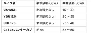 •GN125H・YBR125・CBF125・CT125ハンターカブの価格・スペック・燃費の比較