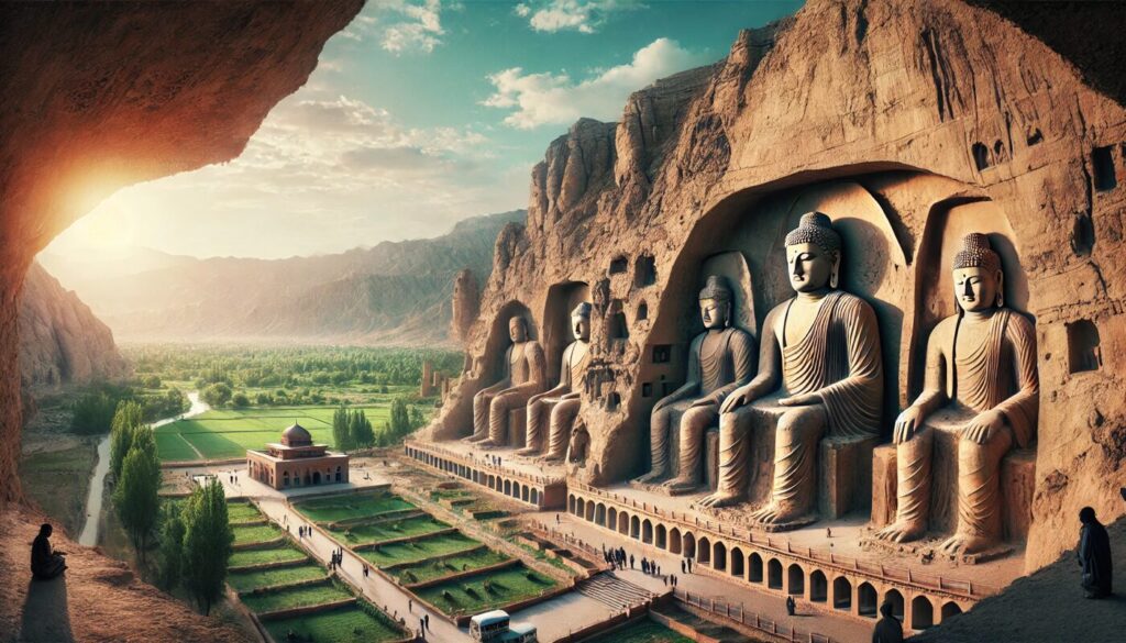 バーミヤン渓谷には、かつて高さ55mと38mの巨大な仏像があり、世界最大級の立像として知られていました。これは7世紀に造られた仏教芸術の傑作で、アフガニスタンがかつて仏教の中心地だった証です。