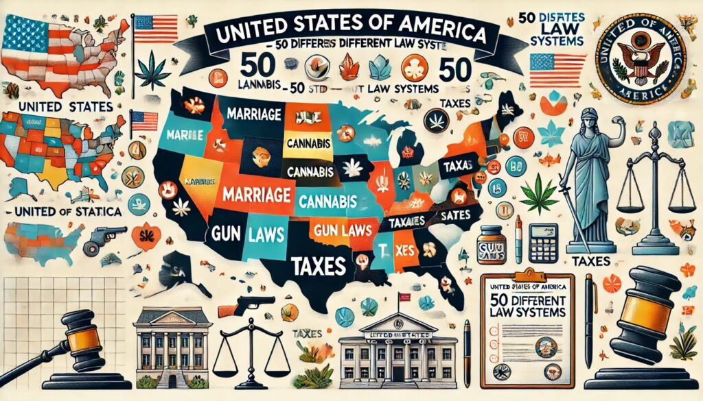 アメリカの州制度の特徴は、法律が州ごとにまったく違うという点です。例えば、ある州では大麻の所持が合法でも、隣の州では重罪になることもあります。また、結婚制度や銃の所持、飲酒可能年齢なども州によって違い、国民であっても他州のルールには慎重になる必要があります。