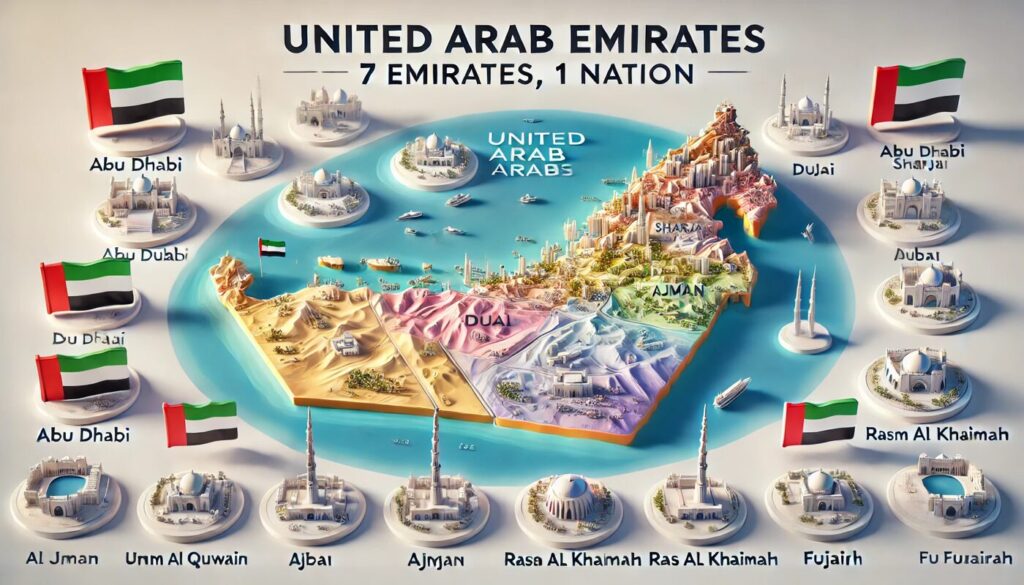 UAEは“ひとつの国”ではなく、アブダビ、ドバイ、シャルジャ、アジュマーン、フジャイラ、ウンム・アル=カイワイン、ラス・アル=ハイマの7つの首長国(エミレーツ)が集まって構成されています。これぞ“合衆国”という呼び方がふさわしい形態です。