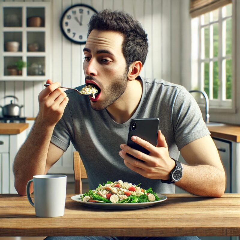 スマホやテレビを見ながらの食事は、噛む回数が減り、満腹中枢が働く前に食べすぎてしまう原因に。