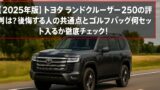 本格ラダーフレーム系の安定感とタフさが魅力。多人数・大荷物の長距離に強く、車格的な安心感も抜群。3列運用時は荷室がタイトになるため、ゴルフは2列運用でバッグ3〜4本が現実的。