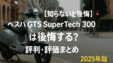 | 3 | GTS SuperTech 300 | Vespa | 278cc | 水冷 単気筒 SOHC 4V | CVT | — | 約125〜130km/h | 90〜110万円 | 50〜90万円 | 上質イタリアン・電子装備充実 |