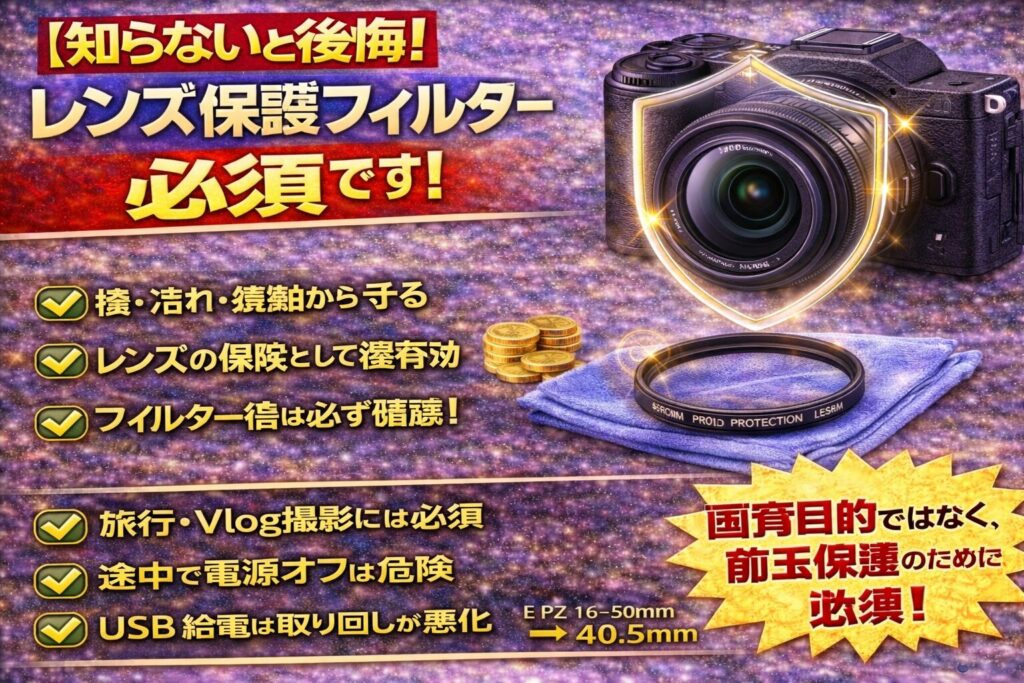 | 必須 | レンズ保護フィルター | ★★★★★ | 前玉保護は最優先 |