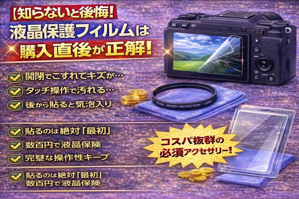 | 必須 | 液晶保護フィルム | ★★★★★ | バリアングル液晶対策 |