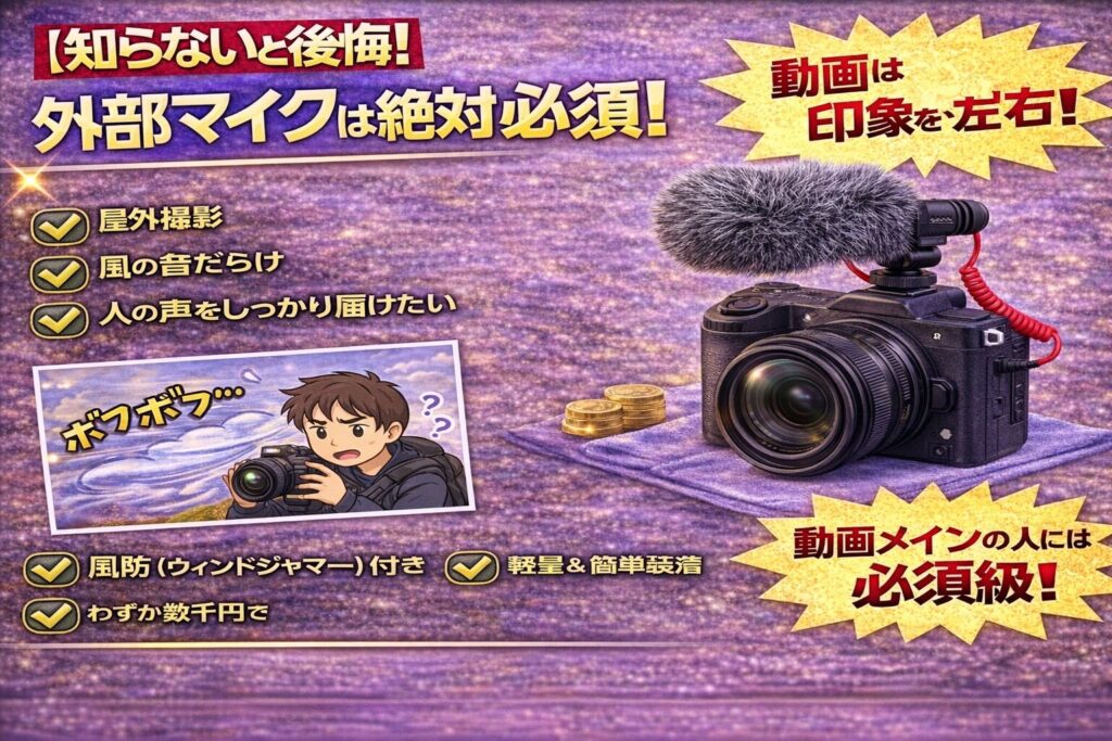 こうした場面では、外部マイクの効果がはっきり出ます。
