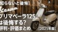 プリマベーラ150は、“移動を上質な時間に変える”ためのスクーターです。価格や積載で国産に劣る面はあるものの、モノコックの乗り味、クラシカルな造形、所有体験の豊かさは代えがたい魅力。
