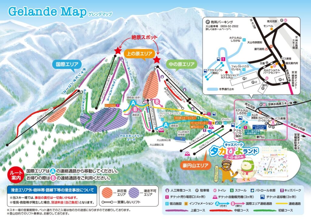 大山周辺は天候の変化が早く、ガスや降雪で視界が急変することがあります。ロングランでは滑走時間が長くなるため、脚への疲労も蓄積しやすく、無理な本数設定は避けることが重要です。標高差による気温変化にも注意しましょう。
