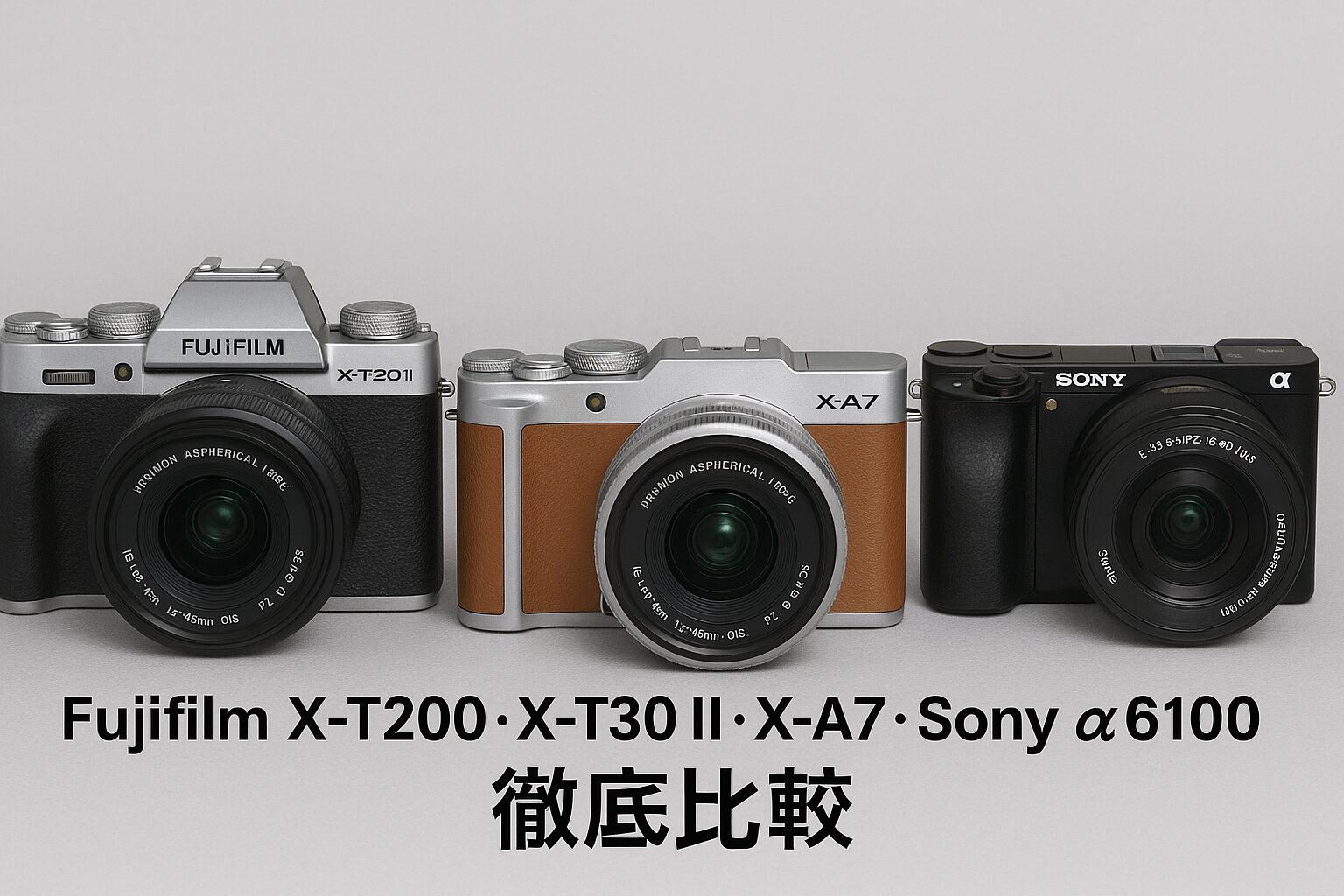 4機種を比較すると、コスパ重視ならX-T200やX-A7(中古)、長く使える性能重視ならX-T30 II、動画も写真も両立したいならSony α6100という選び方ができます。