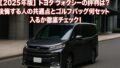 電子制御系やスライドドアモーターにやや負担がかかりやすい傾向があります。頻繁な開閉時は定期的な注油を心がけましょう。足回りのブッシュやリンクも重量車ゆえ消耗が早めなので、3万kmごとに点検を。バッテリーもハイブリッド車特有の高負荷を受けるため、定期診断を行うと安心です。