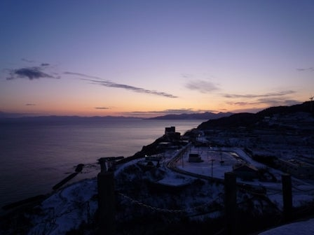 海の向こうにうっすらと見える函館方面のシルエットと朝焼けが重なる瞬間は、元旦ならではの感動的な光景です。