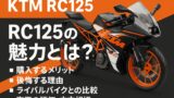 KTM RC125は、125ccスポーツモデルの中でも「最速クラス」として知られるバイクです。MotoGPマシンを彷彿とさせるフルカウルデザイン、軽量なトレリスフレーム、WP製サスペンションを装備し、走行安定性と操縦性を高い次元で両立しています。
