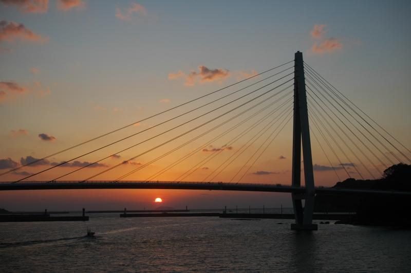 港と橋、朝日が重なる開放的なスポット。